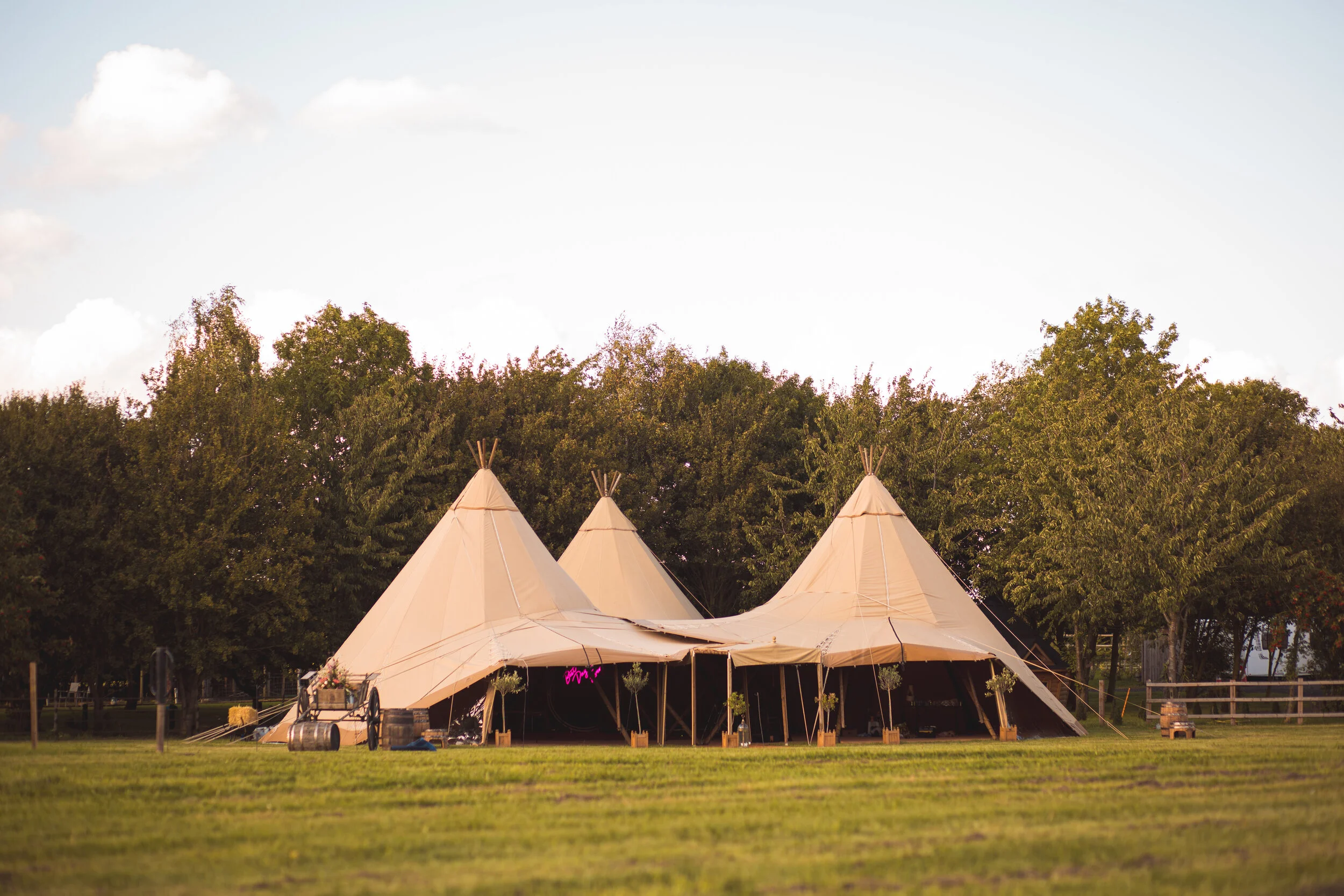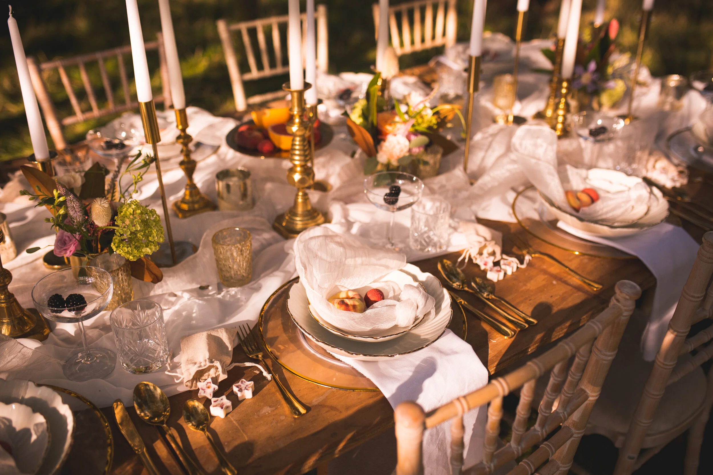 Natural earthy hues and golden tones, with pops of sugar pink, magenta & lilac were seen throughout. Grasses and dried flowers were used to create texture & movement to give a prairie-like feel, whilst dahlias and roses brought a depth of luxury. The styling included a wild floral moongate arch with neon illumination, a rustic outdoor cake display, and a luscious meadow tablescape, which was filled with sumptuous silk textures, endless gold candlesticks and cut crystal glassware. Wild berries, and dissected fruit also added to the sense of opulence.